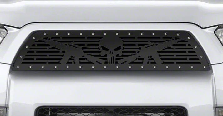 Stylish. Made for the 4Runner, this Upper Grille Insert comes in a matte black finish with raw steel studs. Crafted from 16 gauge stainless steel, this insert has a stylish precision laser cut Punisher AR-15 design that gives your ride its own unique look.