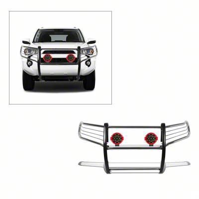 High Strength Quality. The Grille Guard is equipped with 7-inch red round LED lights, providing increased visibility and a bold aesthetic. Crafted from 1 1/2-inch diameter 16-gauge cold-rolled mandrel-bent mild steel tubing, it offers exceptional strength and durability. The polished coating not only adds a sleek finish but also protects against rust and corrosion, ensuring long-lasting performance. Additionally, the grille guard comes with vertical vinyl straps that offer an extra layer of protection against minor bumps and scrapes, preserving the appearance of your vehicle.