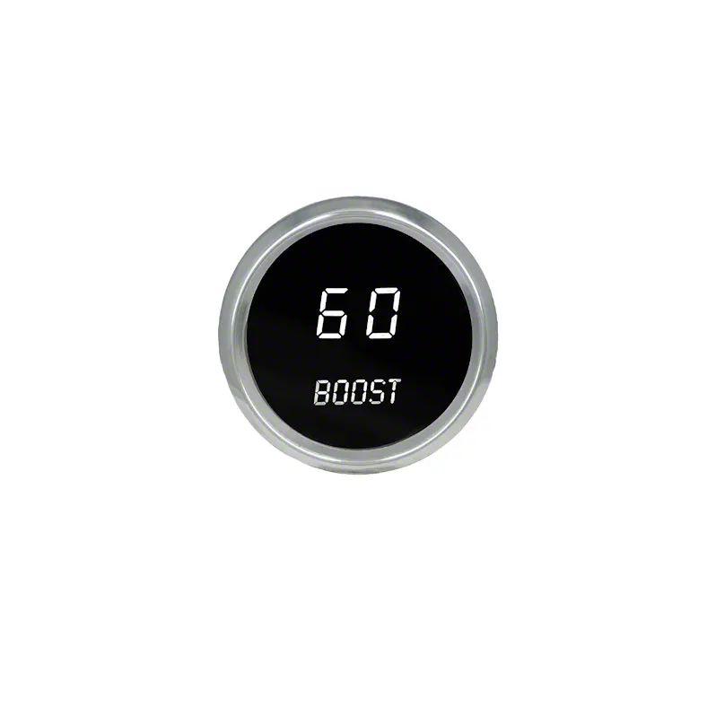 Construction and Appearance. This boost gauge measures 2-1/16 inches in diameter and 1.50 inches deep, making it compact and easy to mount. It features a sleek Chrome bezel, a cool white LED display for clear readability, and automatic night dimming for optimal visibility at any time.
