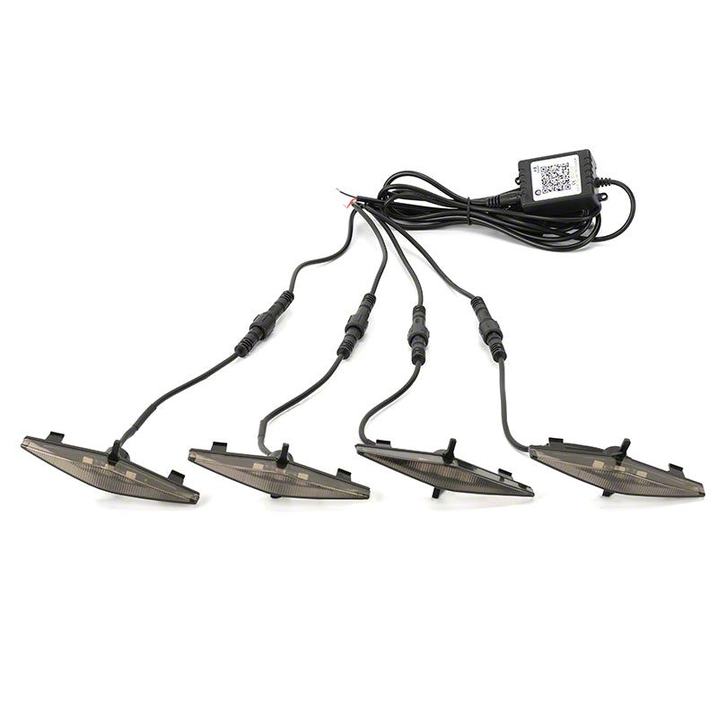 Construction and Appearance. Featuring a matte black finish housing and clear transparent lens, this grille light set is built to be compact and low-profile while delivering brilliant RGB light output. The setup includes over 20 solid color options and multiple lighting modes including music sync, color gradients, voice activation, flashing, strobe, and more. Each unit is water- and dustproof, ensuring long-lasting durability in all driving conditions.