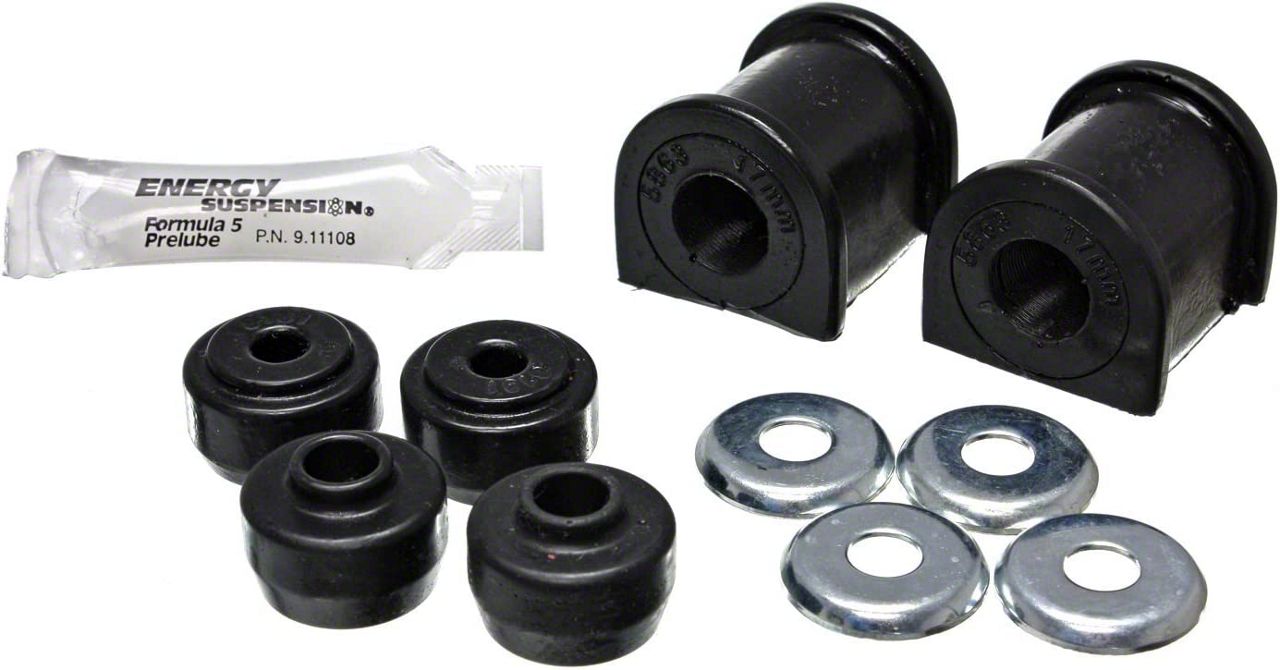 Construction and Appearance. These bushings are crafted to fit 17mm rear sway bars and are made from a durable compound that outlasts standard OEM rubber. With a clean black finish and new-condition construction, they provide a subtle but essential upgrade for a more responsive driving experience.