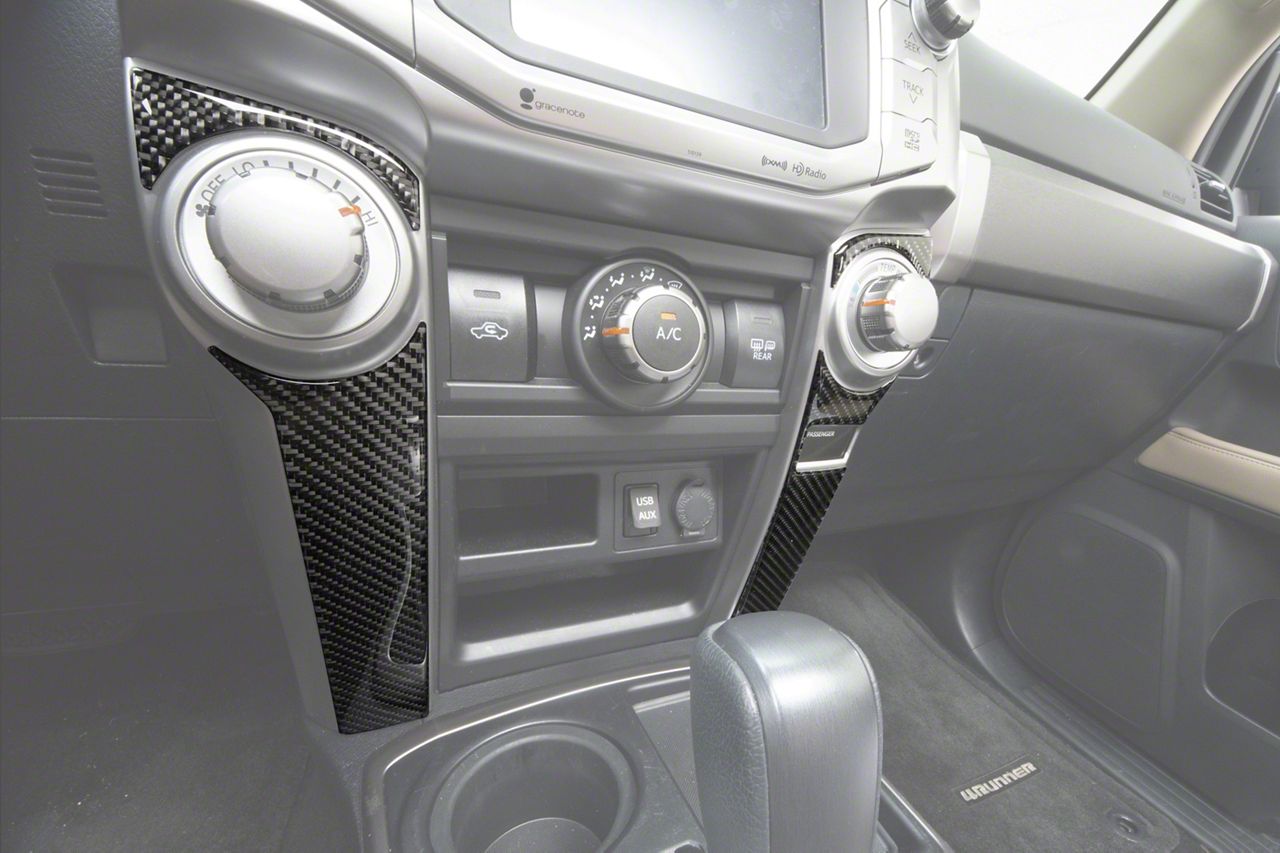 Interior Enhancement. The Side of Climate Control Accent Trim in forged carbon fiber adds a premium touch to the interior of your 2014-2024 4Runner. This trim is precision-cut for an exact fit, enhancing the overall aesthetic and giving your vehicle's interior a refined, luxurious look.
