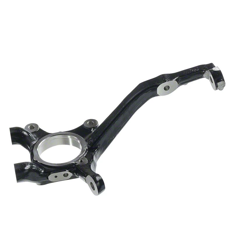 Construction and Appearance. Manufactured from high-quality steel, this steering knuckle offers durability and strength. It is finished in black for a clean, professional look that helps resist corrosion and wear over time, ensuring long-lasting use under various driving conditions.