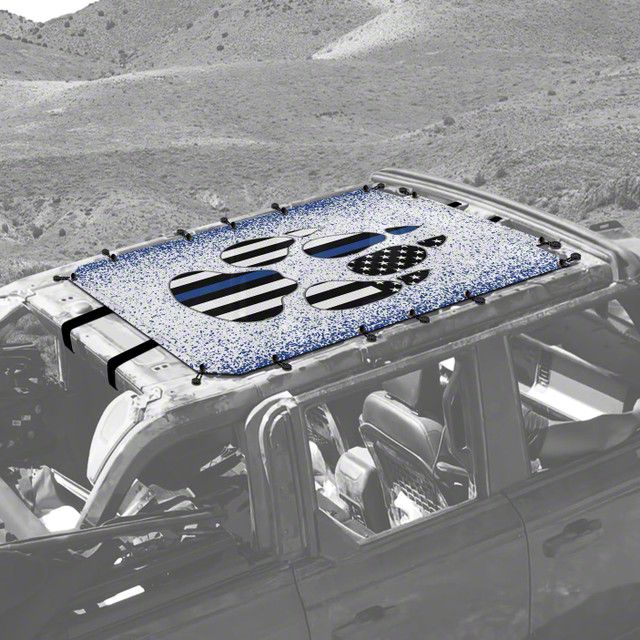 Patriotic Sun Protection. The 4x4 Attitude Sunshade offers effective protection against the sun while adding a patriotic touch to your vehicle with its USA flag blue line paw design. It reduces glare and heat, making your open-top driving experience more comfortable.