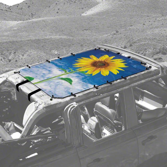 Flower Power. The 4x4 Attitude Sunshade offers effective protection against the sun while adding a blooming touch to your vehicle with its bright Sunflower design with sky background. It reduces glare and heat, making your open-top driving experience more comfortable.