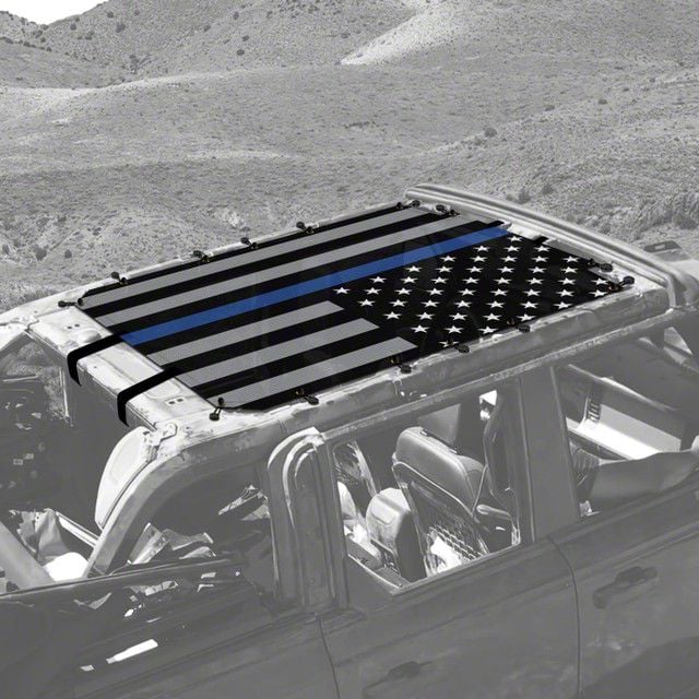 True Blue American. The 4x4 Attitude Sunshade offers effective protection against the sun while adding a patriotic touch to your vehicle with its USA Flag Blue Line Design. It reduces glare and heat, making your open-top driving experience more comfortable.