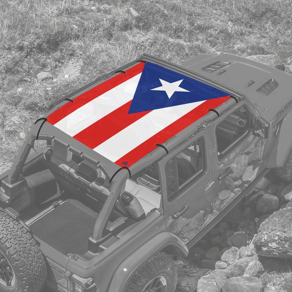 4x4 Attitude Sunshade. The 4x4 Attitude Sunshade is designed for 2018-2023 Jeep Wrangler JL 4-Door models, providing excellent protection against harmful UV rays while adding a stylish touch to your vehicle. Featuring a Puerto Rican flag design, this sunshade combines functionality with cultural pride.