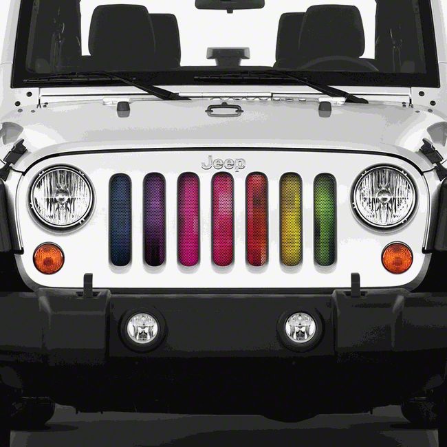 Highly Stylish. Not only is this grille insert protective, but it’s also highly stylish, thanks to the modern, multicolor pixelation design. This grille insert features a multicolor gradient with a new color in each grille opening, adding a vibrant pop of color to your Jeep.