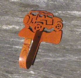 We've got three different Jeep designs on these single coat hooks. We think they would make a great addition to the décor in any Jeep kids' room. One Jeep hook to hold his hoodie. One to hold his PJs and one to hold his backpack. The hand-finished Jeep coat hooks are finished in a rustic orange texture. The hooks are 6.5" tall by 4" wide by 2" deep. They each come with 2 pre-drilled holes. Made in Moab, Utah.