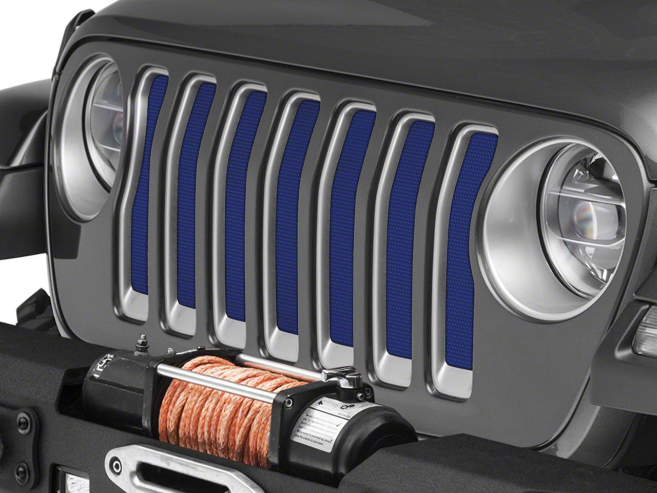 Bold Custom Grille Styling. The Under The Sun Inserts Grille Insert; Deep Water Blue Pearl for the 2018–2023 Jeep Wrangler JL Models without TrailCam and 2024–2026 Jeep Wrangler JL Sport Models adds a distinctive custom accent to the front grille. Designed to enhance the iconic seven-slot grille design, the Under The Sun Inserts Grille Insert; Deep Water Blue Pearl introduces a vibrant color contrast that elevates the overall front-end appearance.