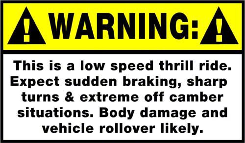 The sticker says: "Warning: This is a low speed thrill ride. Expect sudden braking, sharp turns & extreme off camber situations. Body damage and vehicle rollover likely."