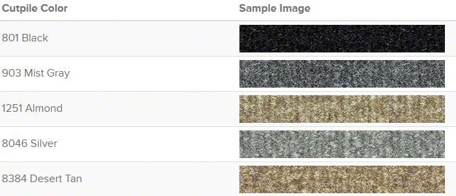 Design. The ACC Complete Cutpile Die Cut Carpet Front and Rear Floor Mats are available in various colors to match your Jeep Wrangler's interior. Whether you prefer a classic black or want to add a pop of color, these floor mats allow you to customize the look of your vehicle's interior while providing functional protection.