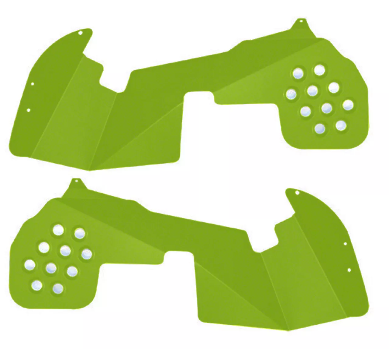 Construction and Appearance. Crafted from lightweight yet durable aluminum, the panels are precision-cut for a seamless fit. The powder-coated Gecko Green finish adds corrosion resistance and a bold, trail-ready aesthetic that stands out in any build.