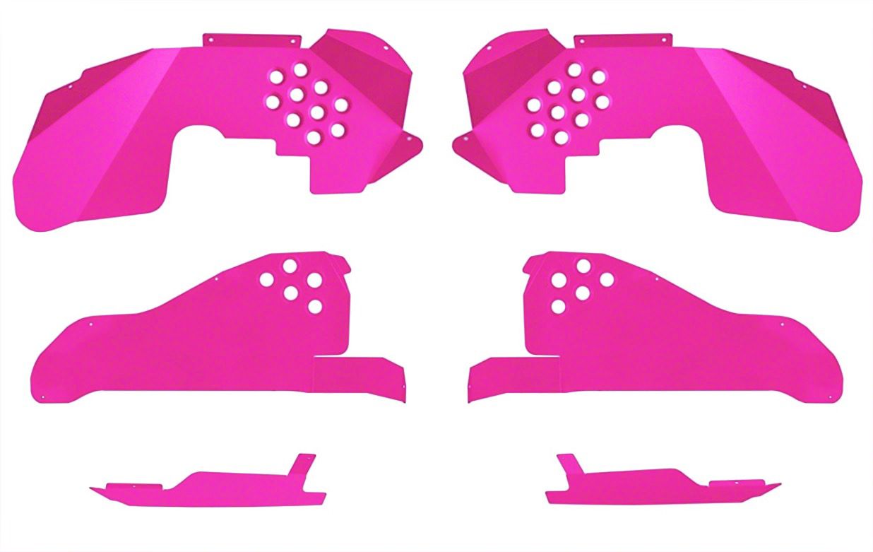 Design. The ACE Engineering Front and Rear Inner Fender Kit with Inserts in hot pink not only serves a functional purpose but also significantly enhances the aesthetic appeal of your Jeep. The striking hot pink color provides a unique, eye-catching look that sets your vehicle apart from others. This bold choice is perfect for Jeep owners looking to make a visual statement with their vehicle's appearance. The vibrant color adds a personalized touch that reflects the owner’s style, making it ideal for those who wish to stand out in the crowd, whether on city streets or off-road trails.