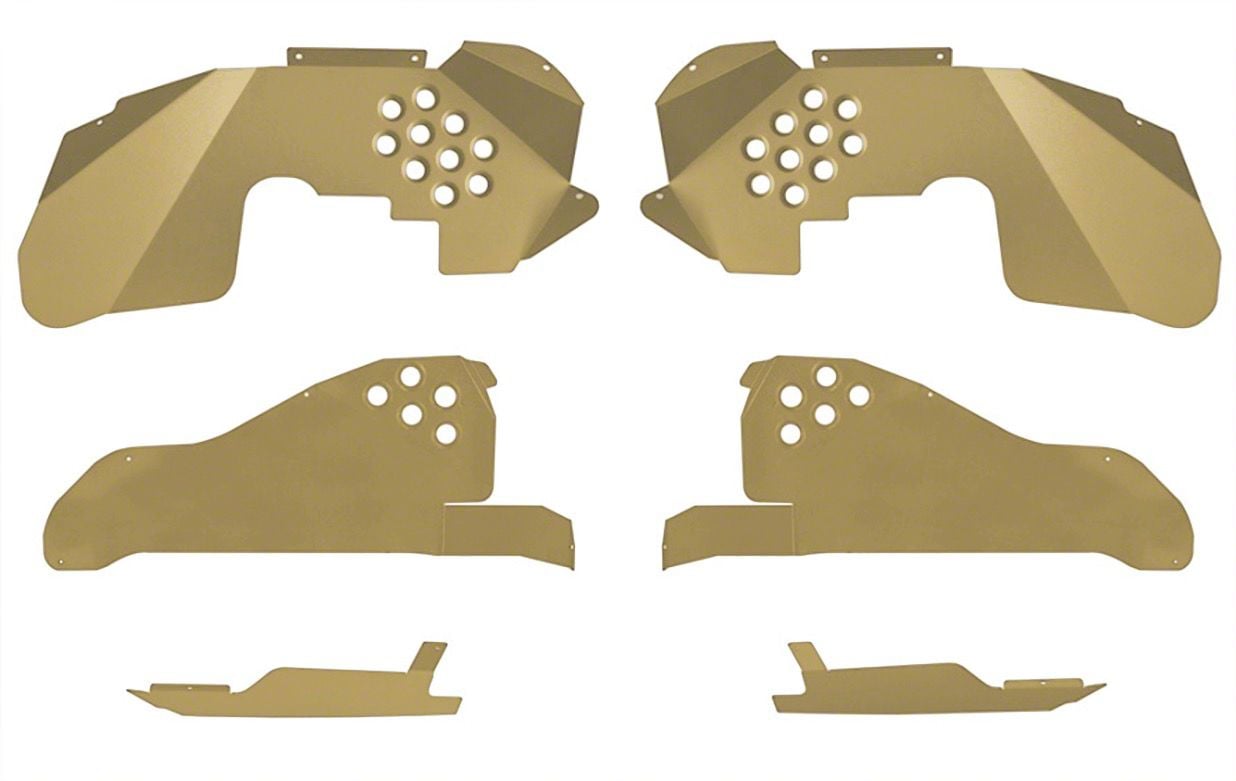 Construction and Features. Featuring a military beige finish, this inner fender kit includes front and rear fenders that are dimple died for added strength and style. Each fender weighs only 3 pounds, ensuring minimal impact on your vehicle's weight. Crafted from brake press formed 5052 aluminum, these fenders provide excellent durability and corrosion resistance. Made in the USA, the kit includes all necessary inserts and mounting hardware for a complete installation. The fenders are designed as a direct replacement, making them easy to install without extensive modifications.