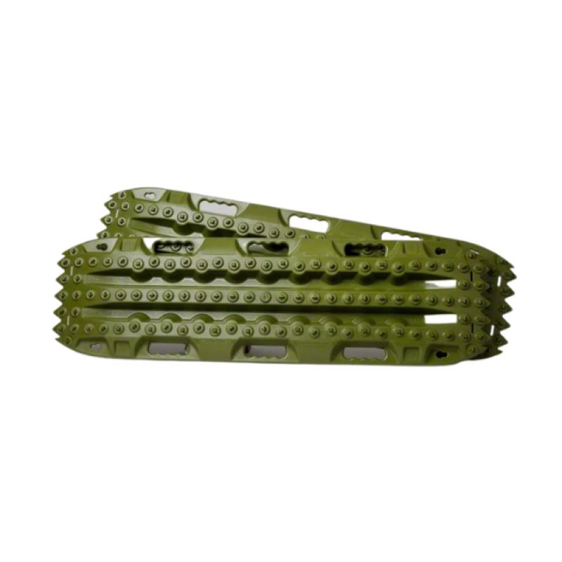 Construction and Appearance. Finished in a military-inspired olive drab, these boards are built tough and crafted using 100% U.S.-sourced materials and labor. They feature a heavy-duty thermoplastic construction that stands up to repeated abuse, and their pre-formed drill bit alignment holes make field repairs simple in case of damage. Each board includes aggressive teeth for traction and reinforced sections to handle vehicle weight under pressure.