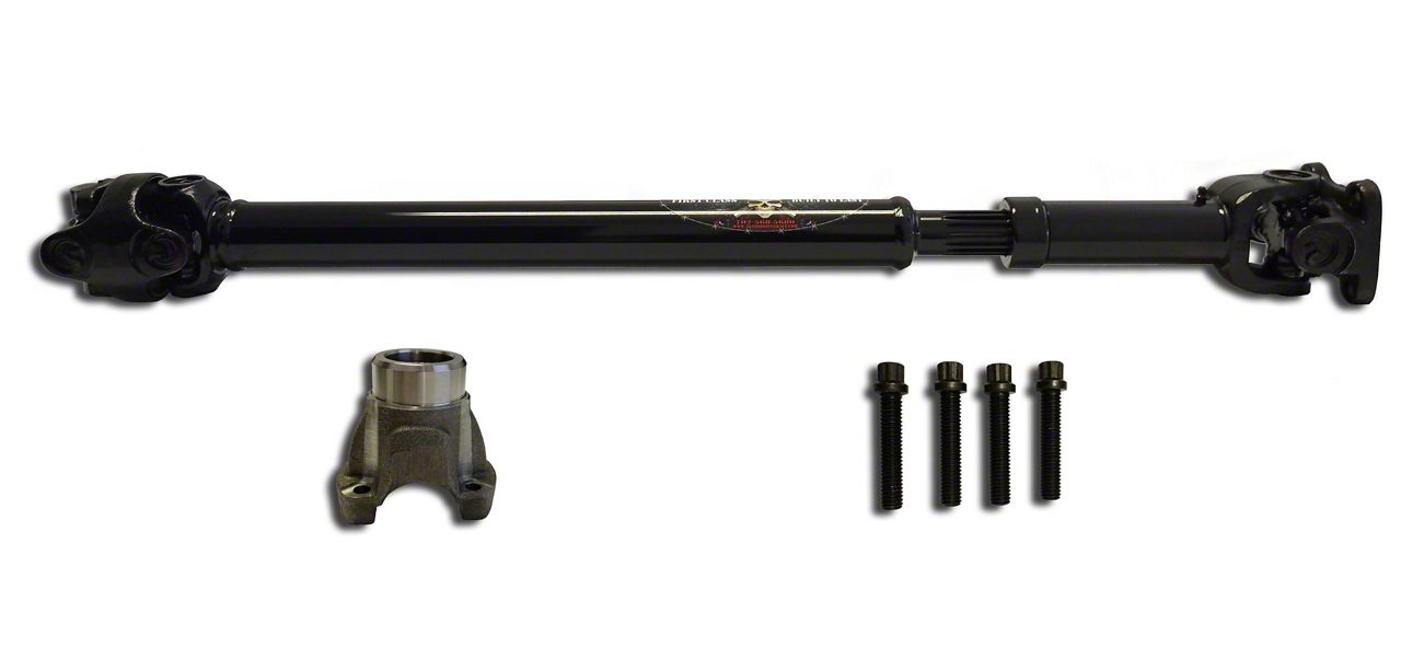 Quality and Driveshaft Ability. The front driveshaft is built to withstand serious off-road thrashing and delivers the strength it takes to handle a 4.5-inch lift with beefy tires. Each front driveshaft is custom built to a specific Jeep and works with anything up to a 37-inch tall tire. Every driveshaft is meticulously measured, built and welded for strength and durability here in the USA.