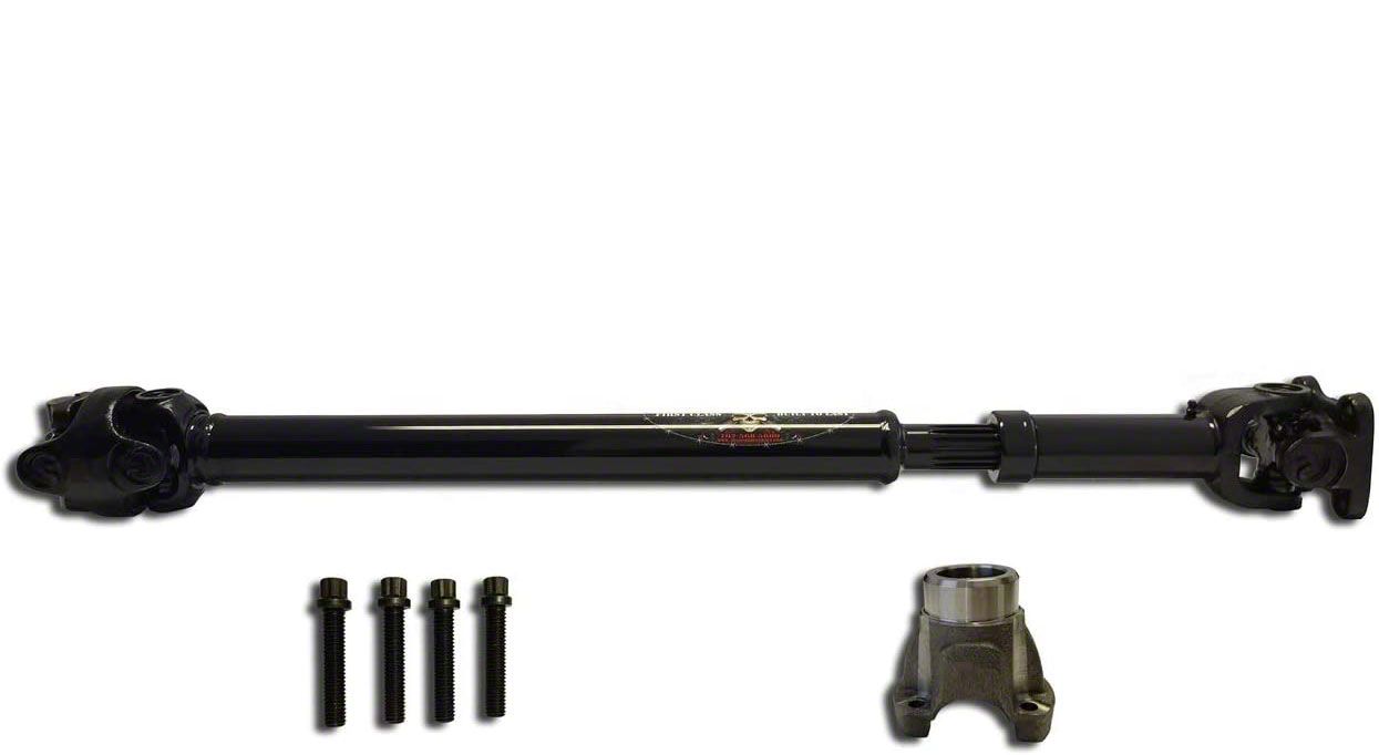 Heavy-Duty Build Quality. This front 1310 CV driveshaft is constructed from high-grade DOM steel tubes measuring 2 inches in diameter with 0.120-inch thick walls for maximum strength. Also, this front driveshaft is machined to accurate parameters, providing a factory fit. Meanwhile, its U-joints and transfer case yoke are forged from premium steel, making these parts extremely strong. Finally, this driveshaft assembly is finished in a corrosion-resistant black powder coating.