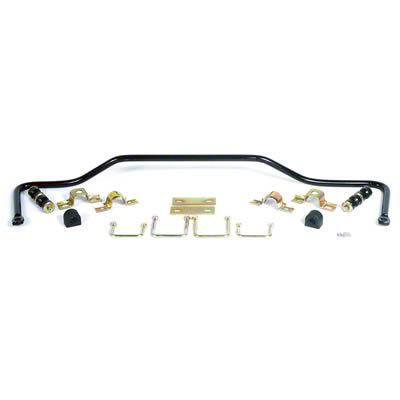 Durable and Complete. This rear sway bar is crafted from high-grade carbon steel and stress-relieved for durability. Its black powder-coated finish not only adds a sleek look but also provides corrosion resistance for long-lasting performance. The 12-gauge zinc chromate-plated brackets and heat-treated end link bolts ensure superior support and added durability. With urethane bushings for a precise fit and easy direct bolt-on installation, this sway bar comes complete with all the necessary hardware.