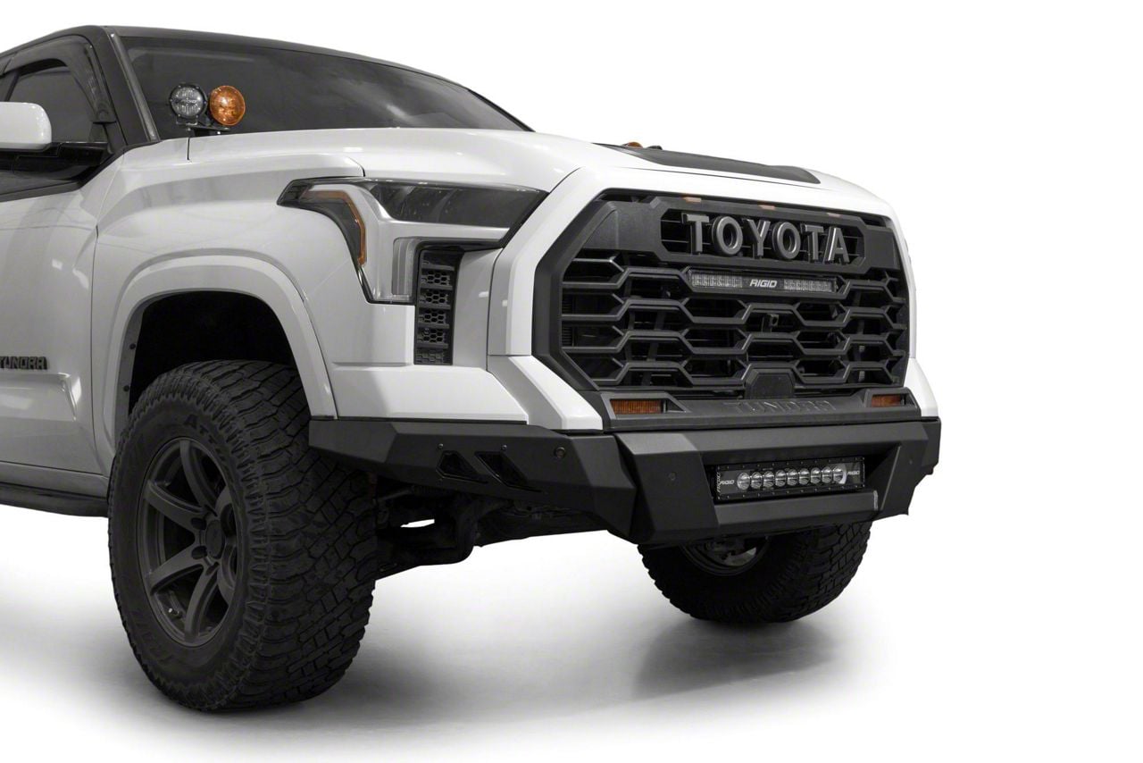 Heavy-Duty Front Protection. The Addictive Desert Designs Black Label Bumper provides enhanced protection and aggressive styling for your 2022-2026 Toyota Tundra. Designed as a front bumper replacement, it integrates rugged construction with lighting support, making it ideal for both off-road utility and street appeal. This bumper includes a mount for a 20-inch LED light bar to improve nighttime visibility.
