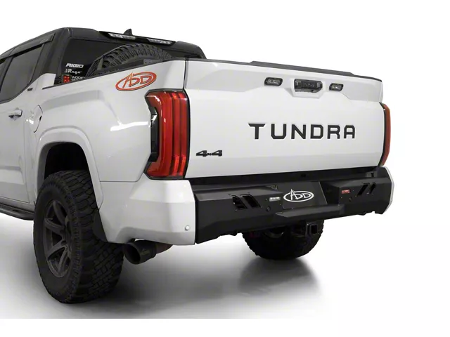 Application. This Addictive Desert Designs Black Label Bumper fits 2022-2026 Toyota Tundra Models. It reinforces the vehicle’s rear protection while enhancing its appearance with aggressive lines and functional integration for modern safety features.