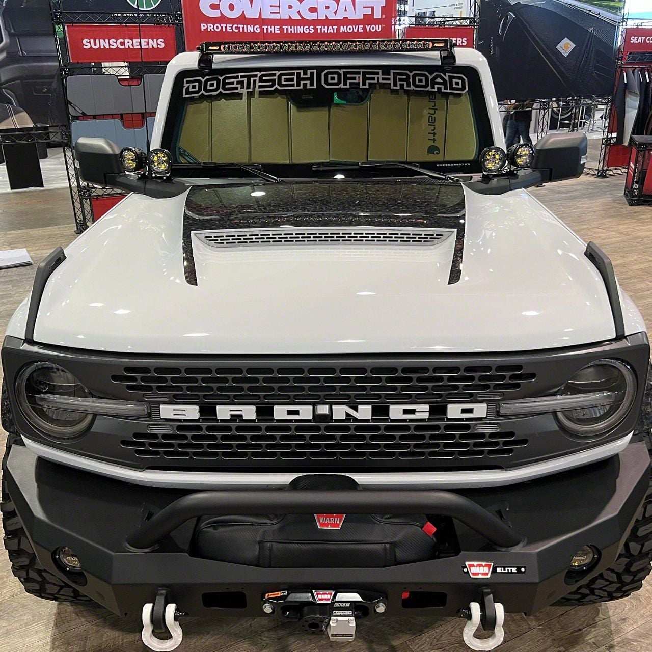 2021-2026 Ford Bronco Ram Air Hood, hand-laid in the USA. Our fiberglass hood comes standard in semi-gloss white. Bolt-on installation. This ram air hood is a perfect match with our 2021+ Ford Bronco Fenders + 2021+ Ford Bronco Rear Quarter Panel Kit . Carbon Finish Options are in the center section only.