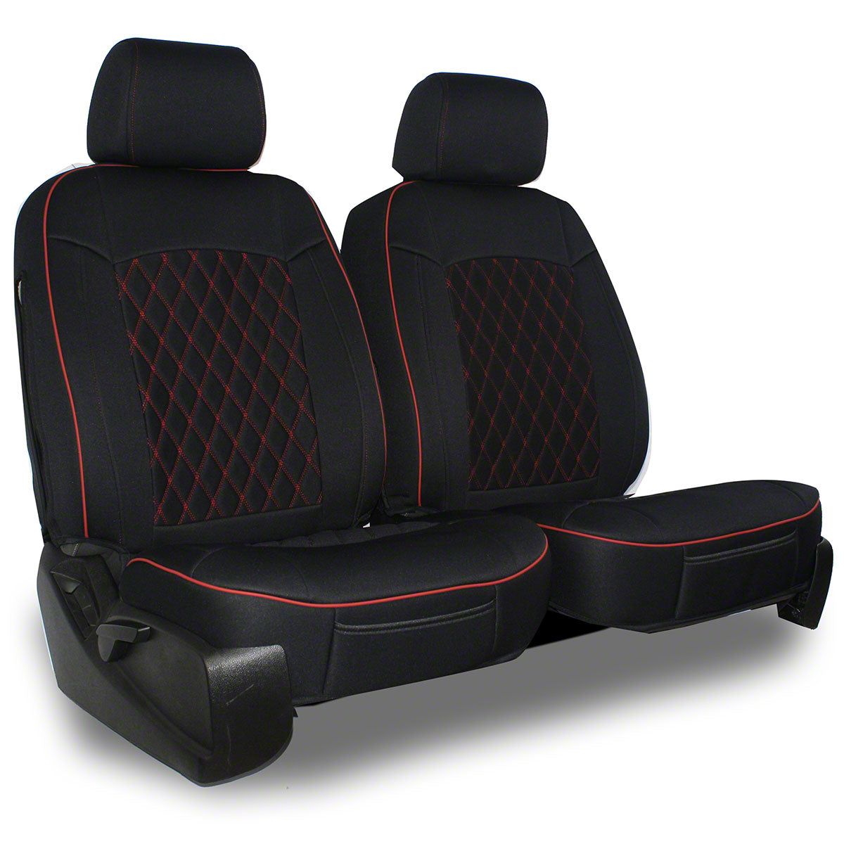 Construction and Appearance. Finished in a sharp racing black and matte red combo, these seat covers are crafted from durable neoprene material that resists water, UV damage, and daily wear. The diamond insert design and low back bucket seat profile provide a sporty, contoured look while the foam insulation layer delivers extra comfort on long drives or trail adventures.
