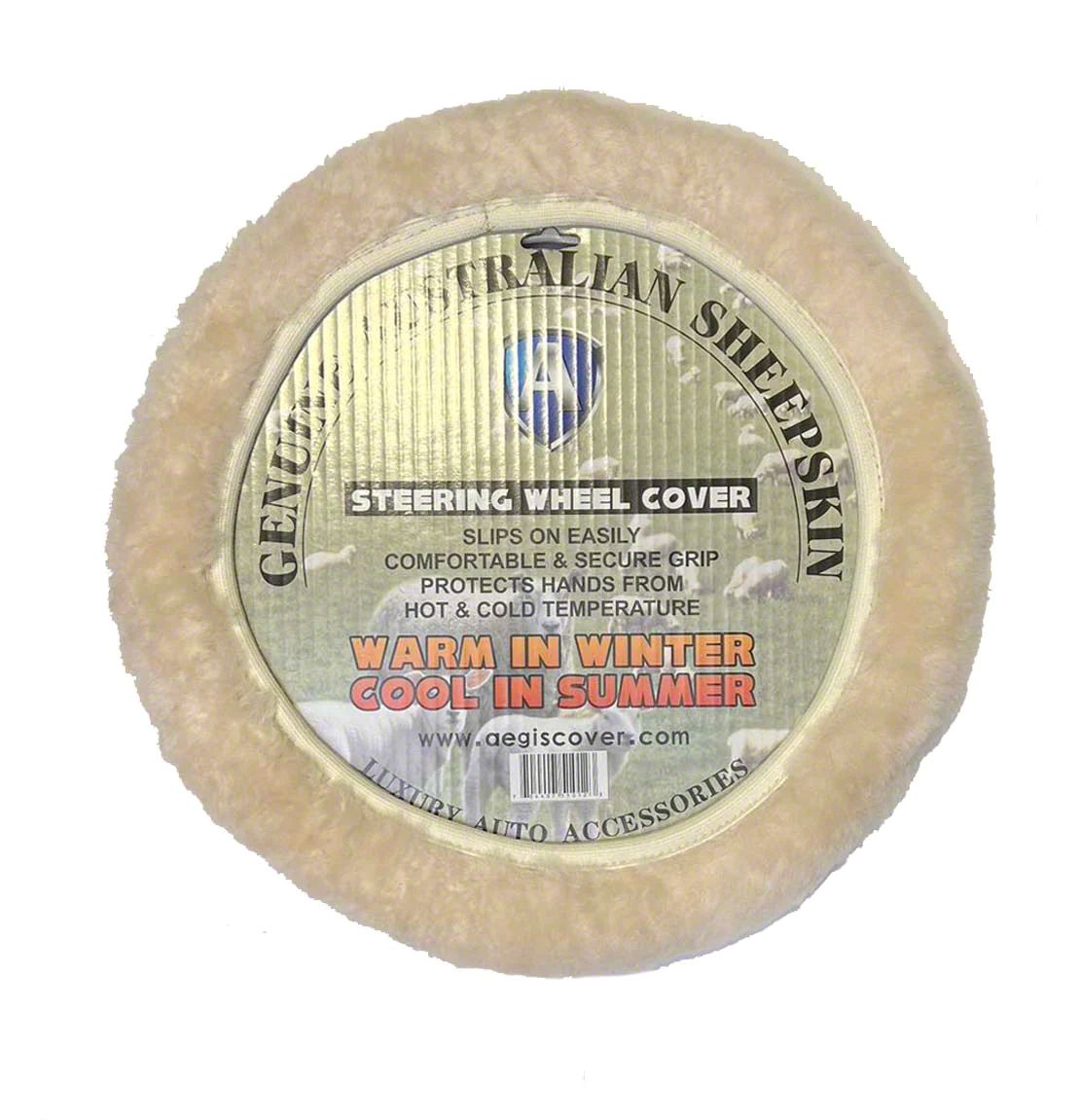 Luxurious Comfort and Style. The Aegis Cover Sheepskin Steering Wheel Cover provides a luxurious upgrade for your vehicle's steering wheel, offering the soft, warm feel of genuine sheepskin. Its sand color adds a stylish and unique look, making it perfect for enhancing your vehicle's interior.