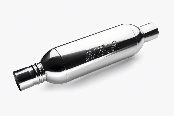 Construction and Appearance. This Aero Exhaust Turbine XL Resonated Muffler is fully welded from 304 stainless steel. The temperature-rated, ceramic, sound-dampening material cancels exhaust drone. Stamped with the Aero logo, the mirror polished finish looks sensational.