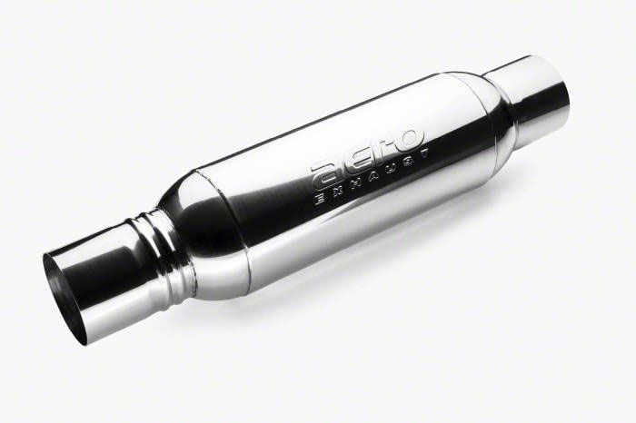 Construction and Appearance. This Aero Exhaust Turbine XL Resonated Muffler is fully welded from 304 stainless steel. The temperature-rated, ceramic, sound-dampening material cancels exhaust drone. Stamped with the Aero logo, the mirror polished finish looks sensational.