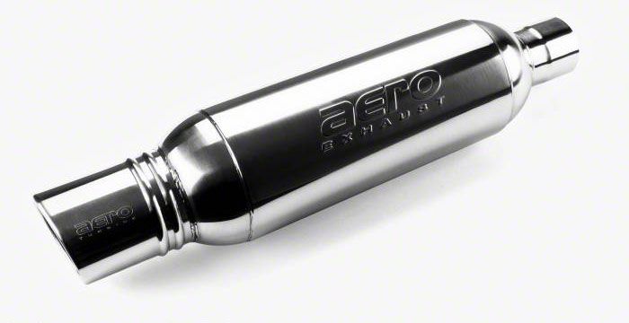 Construction and Appearance. This Aero Exhaust Turbine XL Resonated Muffler is fully welded from 304 stainless steel. The temperature-rated, ceramic, sound-dampening material cancels exhaust drone. Stamped with the Aero logo, the mirror polished finish looks sensational.