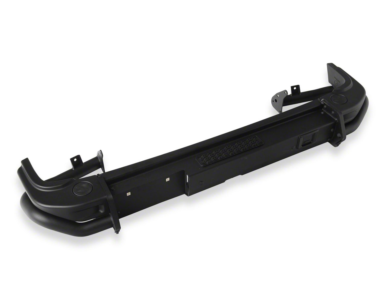Heavy-Duty Construction. This rear bumper’s chassis-mounted corner protection and high-strength tubular steel construction are e-coated and powder-coated to combat corrosion, ensuring longevity and reliability in harsh conditions. The rotomolded corners minimize added weight without compromising strength. Additionally, the molded step pad offers secure footing, making this bumper both functional and practical.