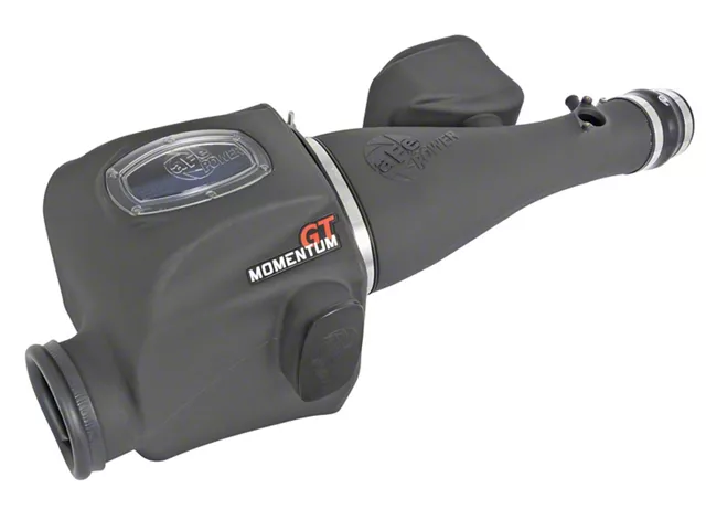 Premium Construction. This Momentum GT intake system has a CAD-designed, 1-piece, roto-molded air intake housing made of black cross-linked polyethylene. This air box features a clear sight window for easier inspection. Moreover, it is also equipped with an auxiliary air scoop for bringing in extra air volume. This system also uses high-quality plastic, dyno-tuned, roto-molded intake tube for a more efficient airflow.