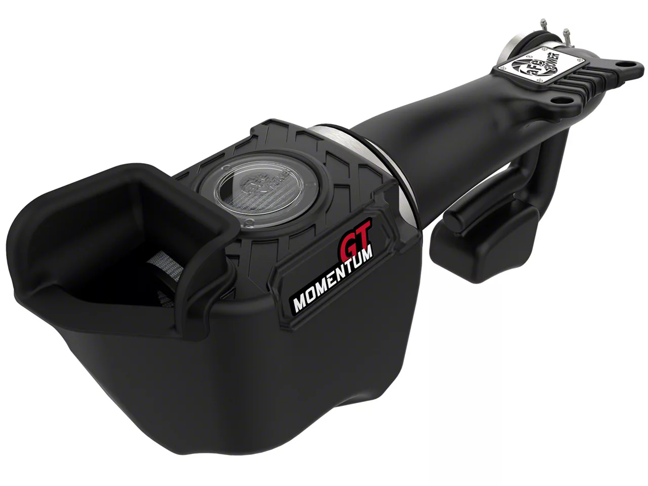 Durable Quality. This Momentum GT Cold Air Intake is made from a one-piece housing and includes an auxiliary air inlet for the coolest air intake charge. This roto-molded housing eliminates the need for multiple components and features a large cross-section to achieve the maximum volumetric flow rate into the turbo adaptor. There is a clear sight window allows for filter inspection without removal of the airbox.