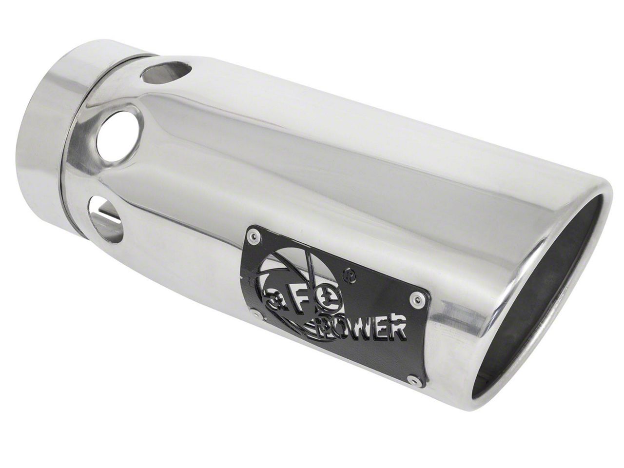 Construction and Appearance. This slash-cut AFE MACH Force-XP tip with intercooled vent is engineered from 304 stainless steel with a laser-cut logo steel plate. The mirror-polished finish looks aggressive against any color truck.