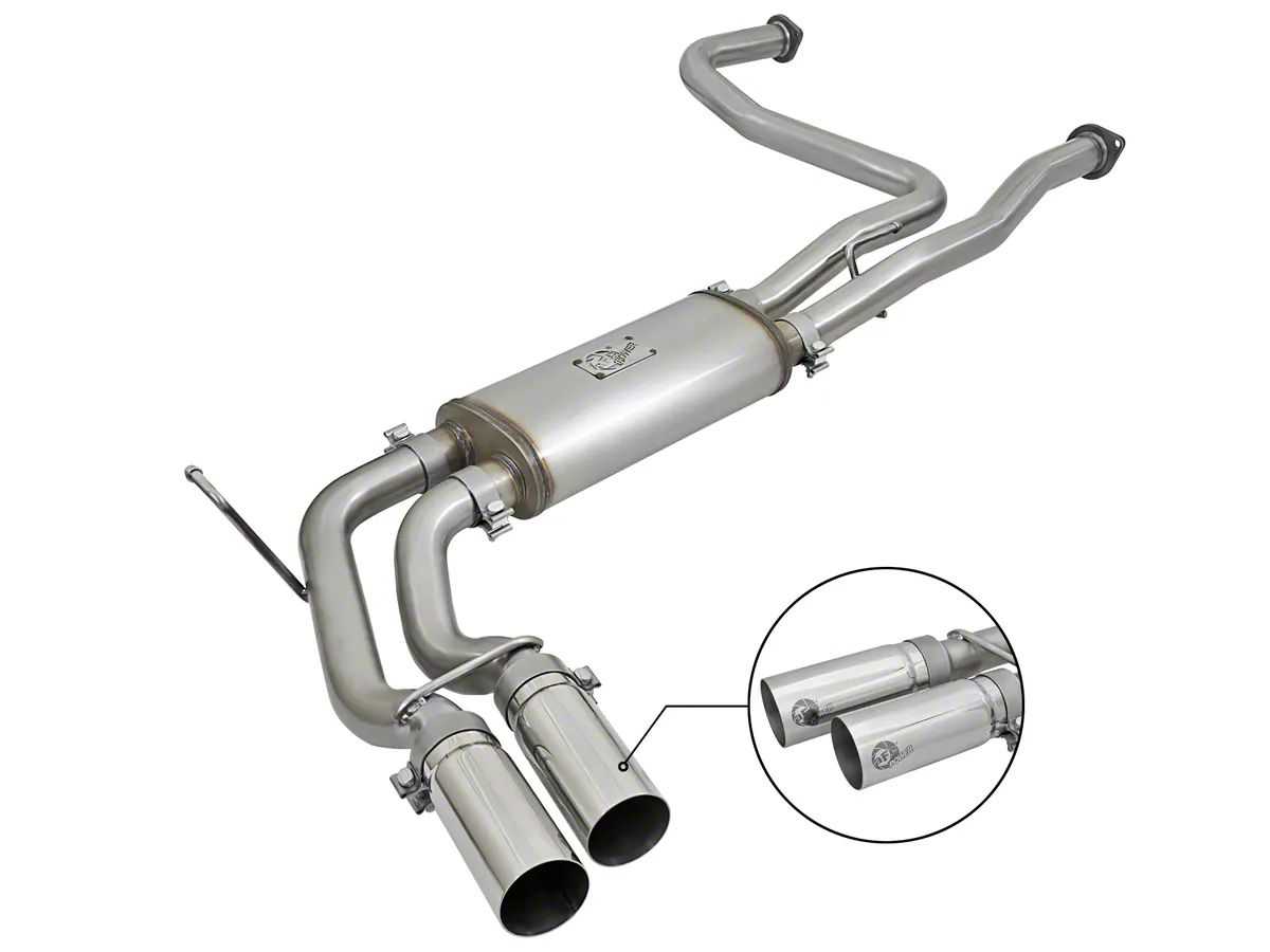 Performance Boost. The AFE Rebel Series 2.50-Inch Dual Exhaust System with Polished Tips is designed to enhance your vehicle's performance by increasing horsepower and torque. This system also provides an aggressive exhaust sound that enhances the driving experience.
