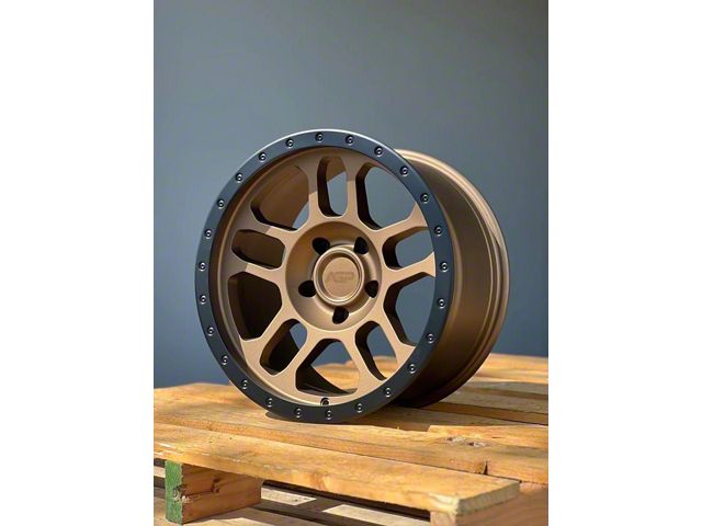 The 17x9 AGP Wheels Trux Bronze with Matte Black Ring Wheel; 17x9 is completed in a sturdy, stunning finish that will be the envy of everyone. The finish has been thoroughly tested to make sure it can handle the rigors of daily driving.
