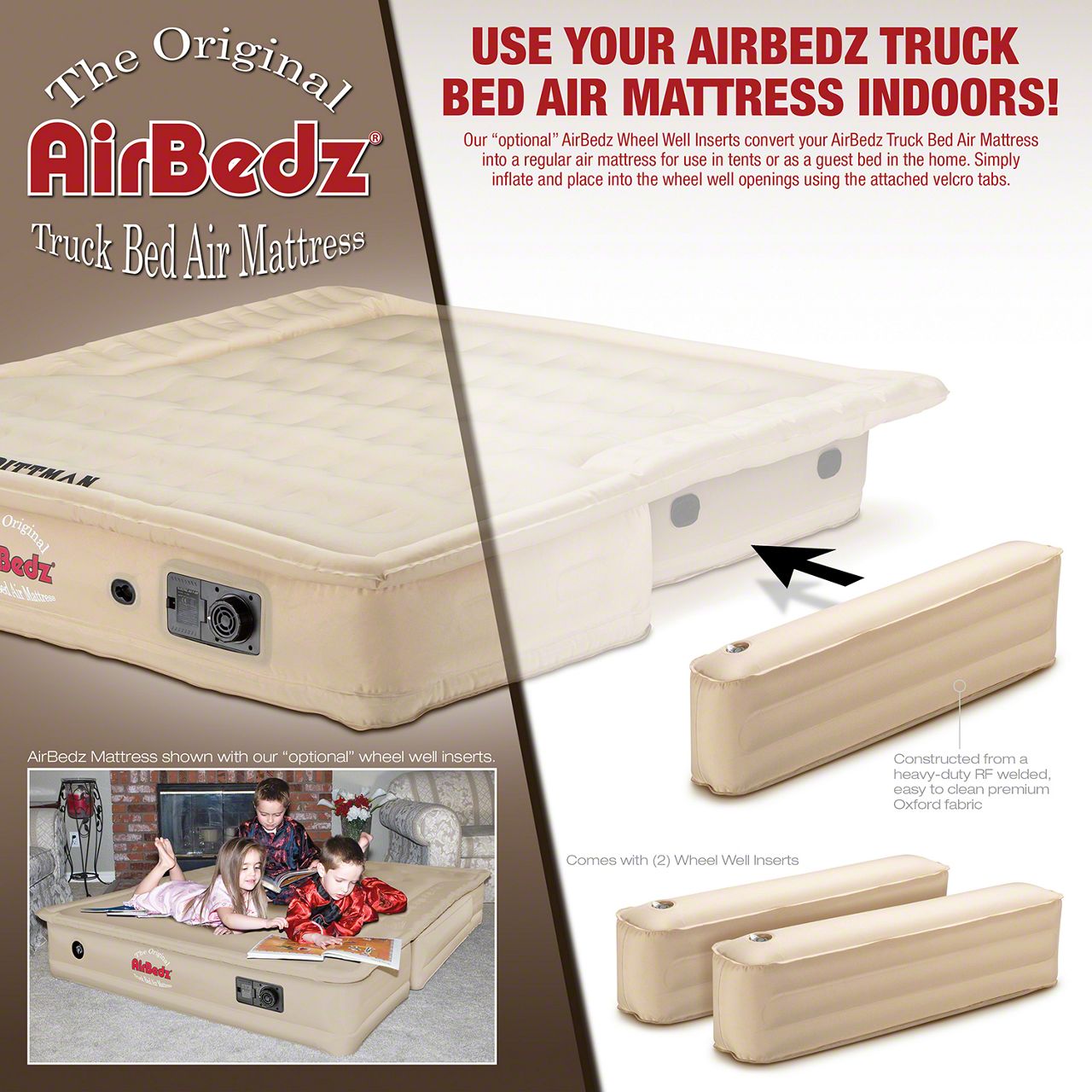 Now in Tan - AirBedz Inflatable Wheel Well Inserts, designed to fit mattress: PPI-505 only. AirBedz Wheel Well Inserts convert your AirBedz mattress into a regular air mattress for use in tents or as a guest bed in the home. Simply inflate and place into the wheel well openings using the attached Velcro tabs. (mattress sold separate)