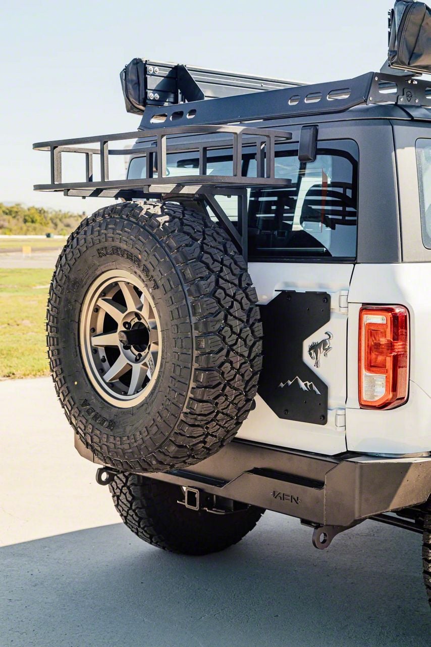 Tailgate Helper. The Allied Expedition Tailgate Reinforcement Bracket with Mountain Logo is a durable and practical accessory designed to enhance your Ford Broncos. With this bracket, you can fortify your swing-out tailgate, allowing it to securely hold a larger spare wheel and tire. This feature is especially beneficial for off-road enthusiasts who require a robust setup to tackle challenging terrains.