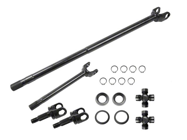 Specs. Alloy USA's Grande axle shaft kit features up to 40 percent stronger axle shafts to upgrade your TJ. These shafts are made from 4340 Chromolly and induction hardened for heavy duty strength. Each shaft is CNC machined and magnaflux inspected for defects. They are then given a black anodized finish for a sleek appearance. Alloy USA uses top of the line technology to manufacture splines stronger than stock. These shafts are 37.5 inches long and feature 30 splines on the inner and outer shafts. This kit includes everything you need to do the job right: the seals, the u-joints and the full circle clips. Alloy USA protects this kit with a 10 year warranty.