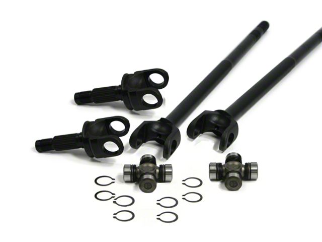 Specs. These sturdy aftermarket front axle shafts by Alloy USA are burly enough to handle the weight and power of a 2003 to 2006 TJ Wrangler Rubicon with a Dana 44 front axle. Fashioned from high tensile strength 4340 Chromoly alloy, the axles withstand stresses and recover from torsion with 30 percent to 40 percent greater effectiveness than ordinary 1040 axles. These components are tempered and induction hardened for maximum strength, then inspected with magniflux to ensure there are no hidden cracks from the manufacturing process. They offer full support to both large aftermarket tires and to highly demanding use such as rock crawling and wheeling through extremely difficult terrain. A black anodized finish prevents rust, corrosion, and scratching.
