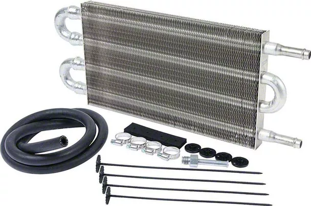 Universal coolers reduce operating temperature of the fluid, extend life of the transmission and provide better performance. Use as a stand alone cooler or as an auxiliary unit to increase cooling capacity of a stock system. Increased cooling is recommended when using a high stall converter, or if the vehicle is used for towing. Coolers have 3/8" barbed fittings and include rubber hose, clamps and mounting kit.