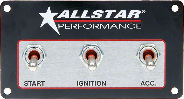 Compact three switch panel has sealed weatherproof toggle switches for use in open cockpit vehicles or when exposed to harsh conditions. Panel measures 2-1/2" tall x 4-5/8" wide and includes one momentary start switch, one ignition switch and one accessory switch. Switches are rated up to 20 amps and each circuit includes 60" of 14AWG wire for easy connections.