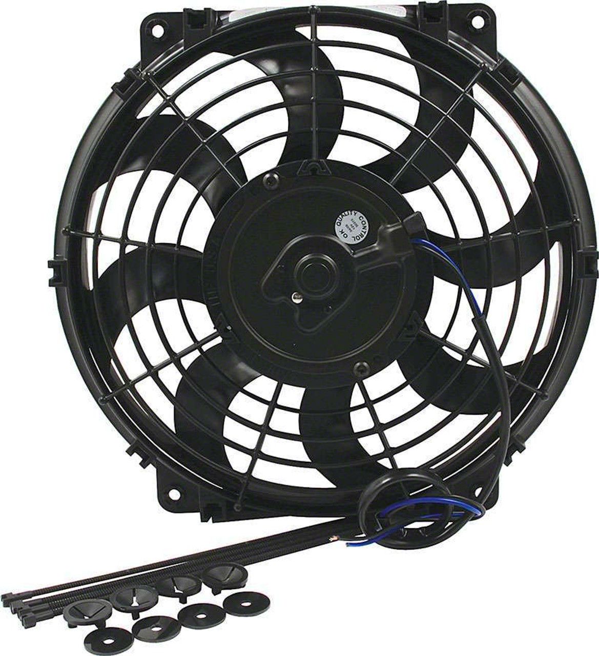 Electric fans require very little amperage and are suitable for use in race car or tow vehicle. Fans are set up as puller units, mounted behind the radiator. By flipping blades, reversing wires, and mounting in front of radiator, fans will operate in pusher configuration. Each unit includes a mounting kit.