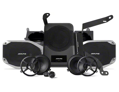 Top-Off Sound. Your JL Wrangler begs for top-off drives, whether cruising down the highway or traversing over trails, so you need a sound system that delivers music for all your adventures, that's where the Alpine 300-Watt Complete Sound System Upgrade Package comes into play. This Alpine sound system was tuned for the unique cabin environment of the JL Wrangler. The weather-resistant speakers are designed for powerful, top-off performance that’s unhindered by weather, wind, or other noise while driving. The 6.5-inch mid-bass drivers bring out the full potential of your sound, while the tweeters capture the high frequencies often lost in music reproduction. The 8-inch compact subwoofer adds deep, accurate bass that grounds your sound system.