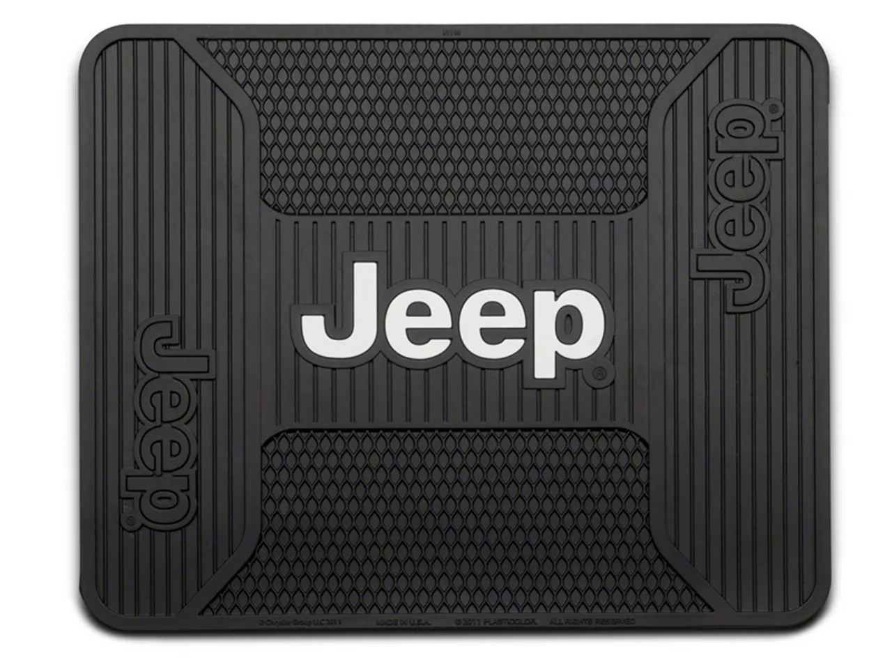Stylish Protection. Protect the carpet in your Gladiator's cargo area with the Alterum Jeep Logo Elite Rear Utility Floor Mat. It features stylish Jeep logos in white and rugged textures to keep water up and off of your carpet. Clean up is hassle free using soap and water