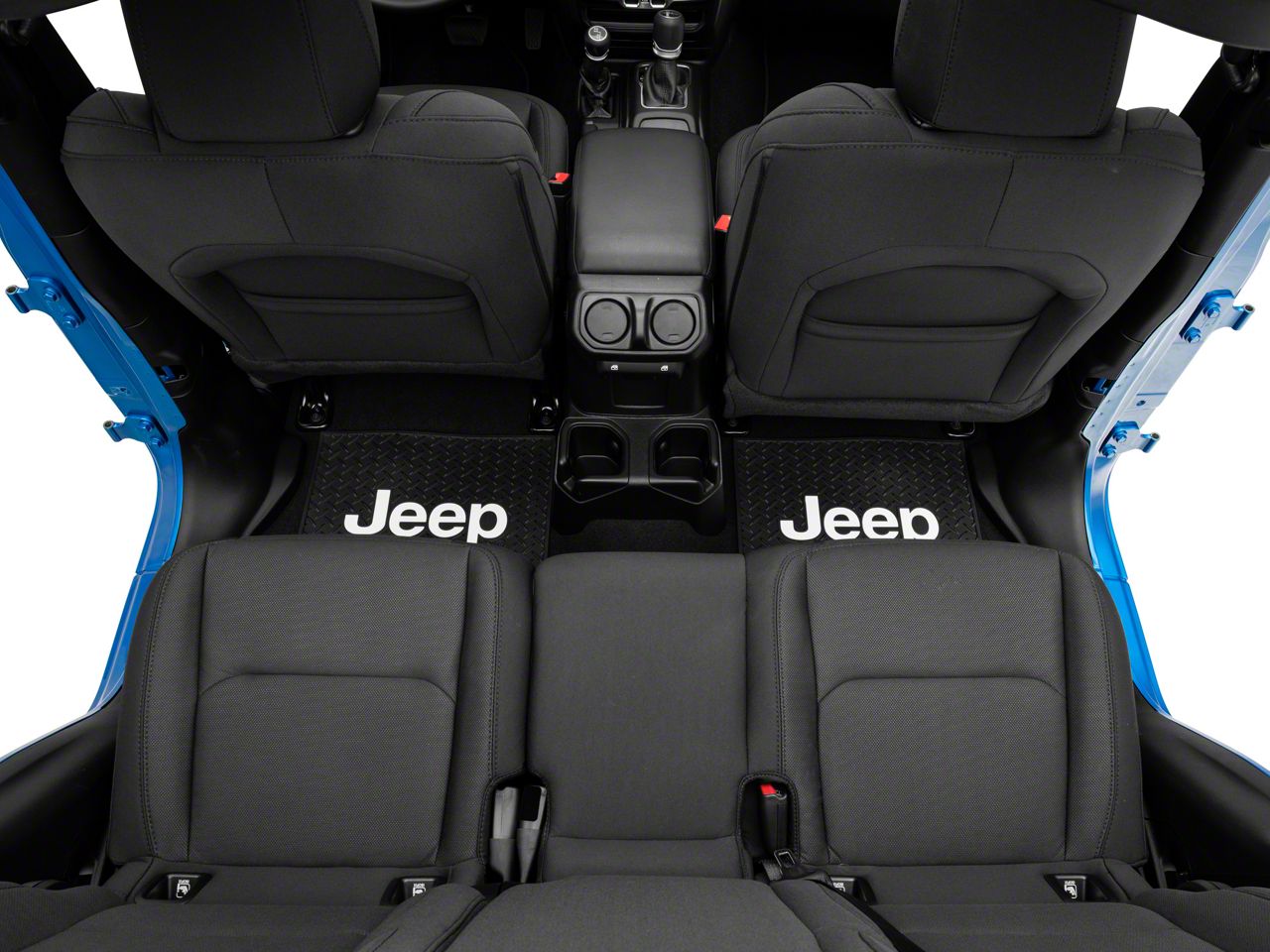 Stylish Protection. Protect the carpet in your Jeep's rear seating or cargo area with the Alterum Jeep Logo Rear Utility Floor Mat. It features stylish Jeep logos in white and a rugged diamond plate texture for the ultimate in styling no matter where you use it.
