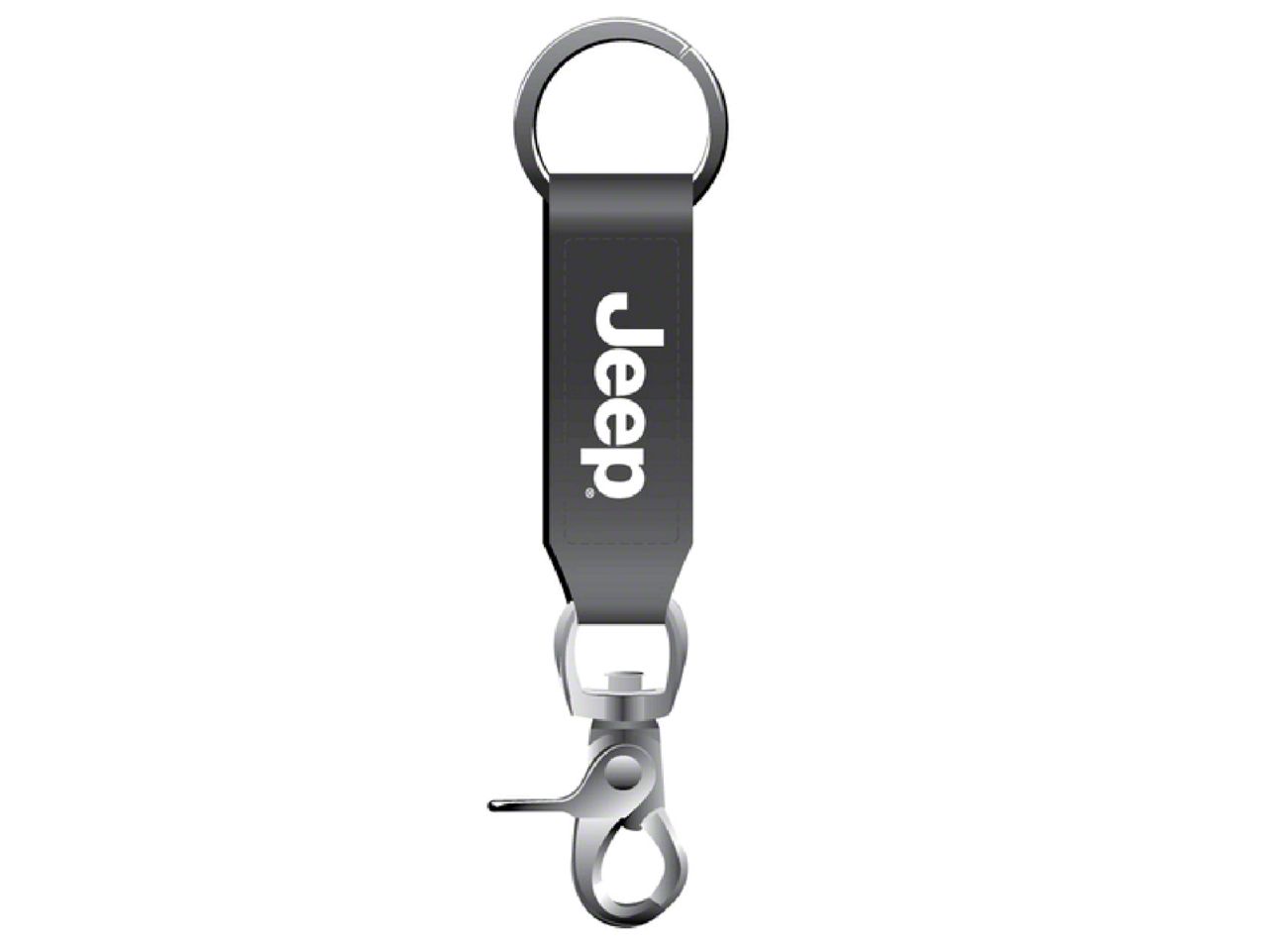 Jeep Strap Key Chain. This awesome black leather Jeep Logo Strap Key Chain is perfect for organizing your keys in 1 place. A convenient, lever-back closure at 1 end allows you to attach it to your belt loop, purse strap, a zipper pull. On the other end is a key-loop that can accommodate any number of keys and of course the best part is that the black strap features the "Jeep" logo in white.