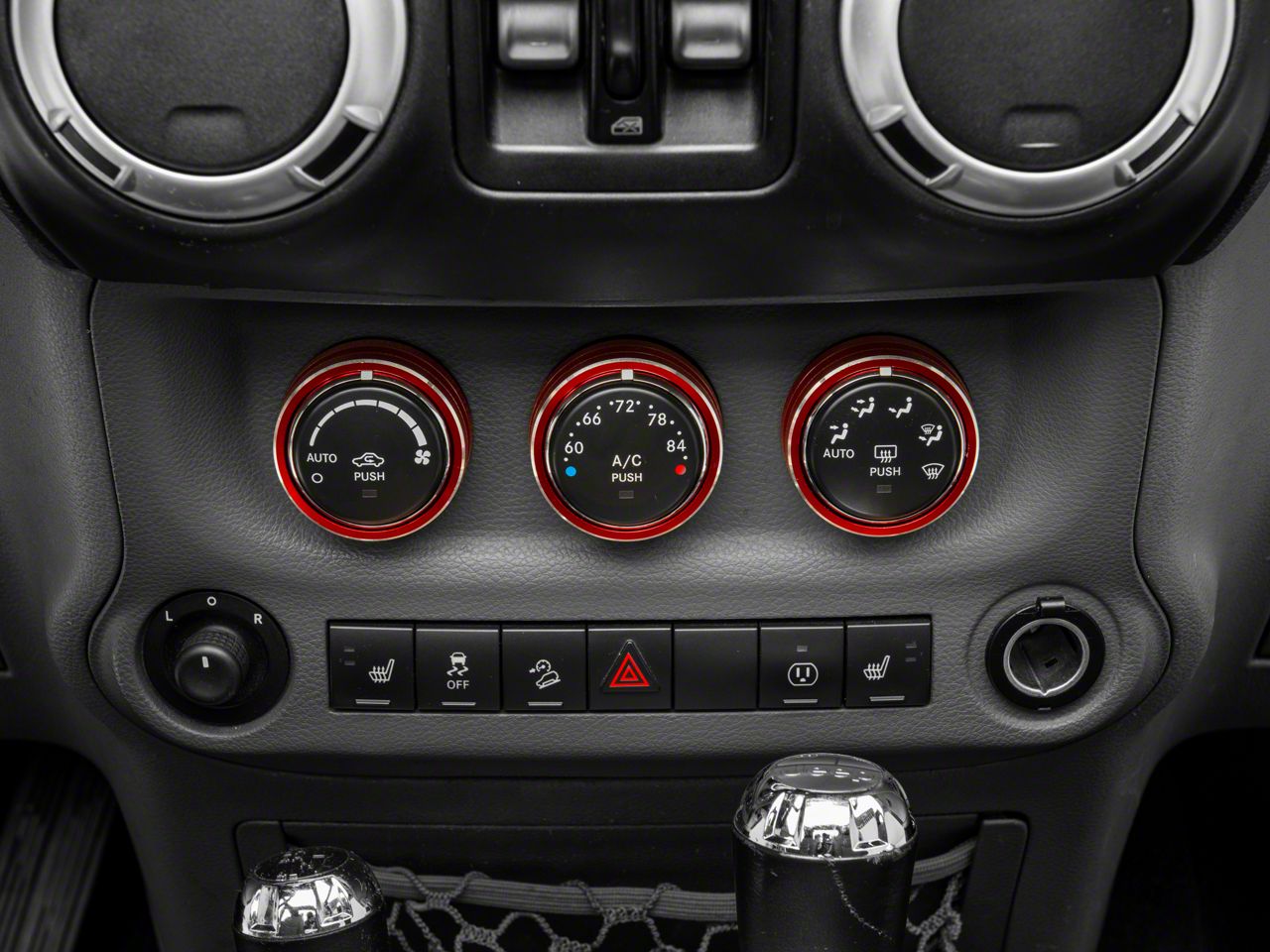 Custom Interior Styling. Add impressive custom styling to your JK Wrangler's interior with a set of Red Anodized Billet Aluminum HVAC Control Trim Ring Bezels. These great looking Trim Ring Bezels perfectly match Alterum's complete line of red anodized interior styling parts.