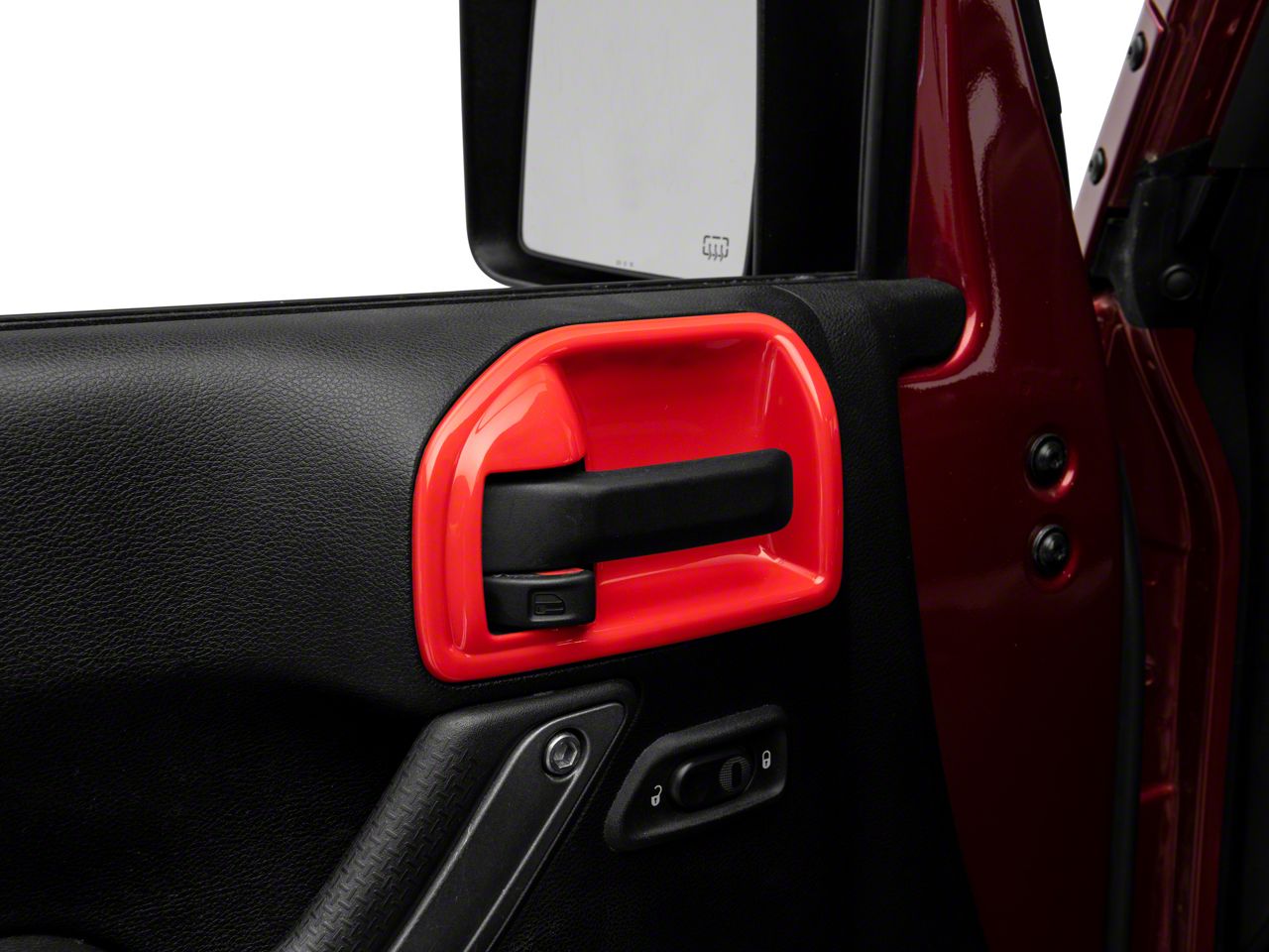 Application. These RedRock Interior Door Handle Trim Bezels; Red are designed to fit 2007-2018 Jeep Wrangler JK 2-Door models. Sold as a set of (2) Trim Bezels.